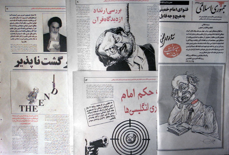 Drawings depicting British author Salman Rushdie are all over the Tehran morning press 14 February 2000, one day after Iran's state organization for Islamic propaganda said that the fatwa issued in 1989 by the late Iranian spiritual leader Ayatollah Ruhollah Khomeini against the author of The Satanic Verses was still in force and that Muslims must help carry it out. (ELECTRONIC IMAGE) (Photo by HENGHAMEH FAHIMI / AFP)