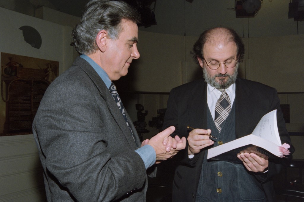 British writer Salman Rushdie (R) signs his book to french journalist and TV host Bernard Pivot (L) before the TV show "Bouillon de Culture", on channel Antenne 2, on February 16, 1996, in Paris. AFP PHOTO JOEL ROBINE (Photo by JOEL ROBINE / AFP)