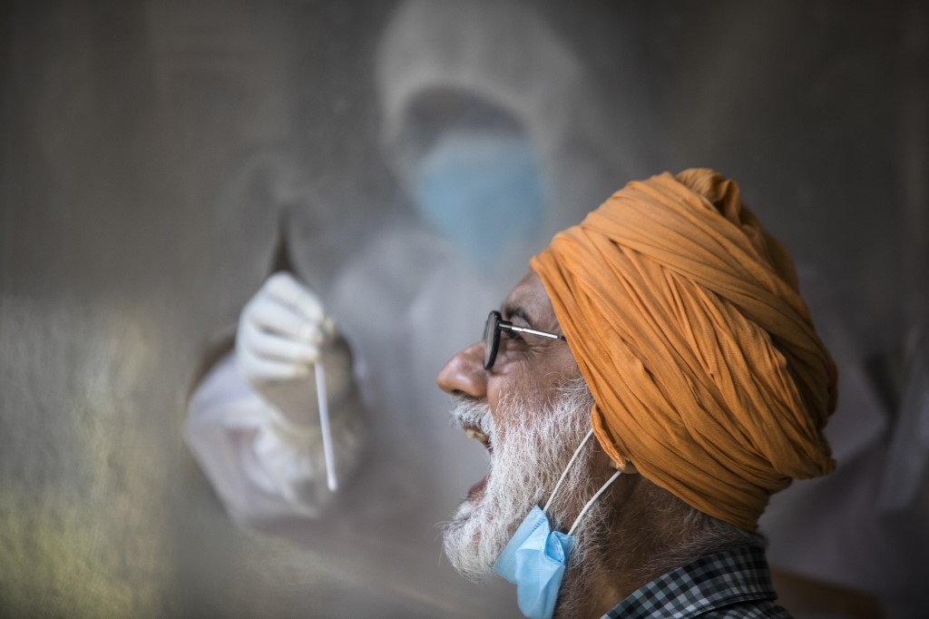 A health official collects a swab sample from a man to test for the COVID-19 coronavirus at a temporary testing center at a hotel after authorities eased restrictions imposed as a preventive measure against the spread of the COVID-19 coronavirus, in New Delhi on June 17, 2020. India's official coronavirus death toll leapt by more than 2,000 on June 17 as the hard-hit country struggles to contain a ballooning health crisis that has overwhelmed hospitals. The news came as Germany urged its nationals in India