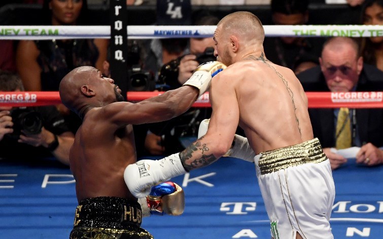LAS VEGAS, NV - AUGUST 26: (L-R) Floyd Mayweather Jr. throws a punch at Conor McGregor during their super welterweight boxing match on August 26, 2017 at T-Mobile Arena in Las Vegas, Nevada. Ethan Miller/Getty Images/AFP