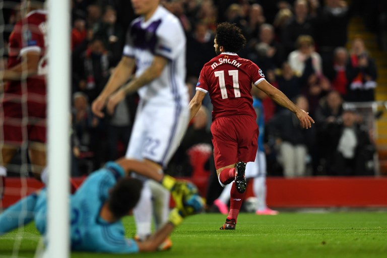 Liverpool's Egyptian midfielder Mohamed Salah (R) celebrates after scoring the opening goal of the UEFA Champions League Group E football match between Liverpool and NK Maribor at Anfield in Liverpool, north-west England on November 1, 2017. Paul ELLIS / AFP