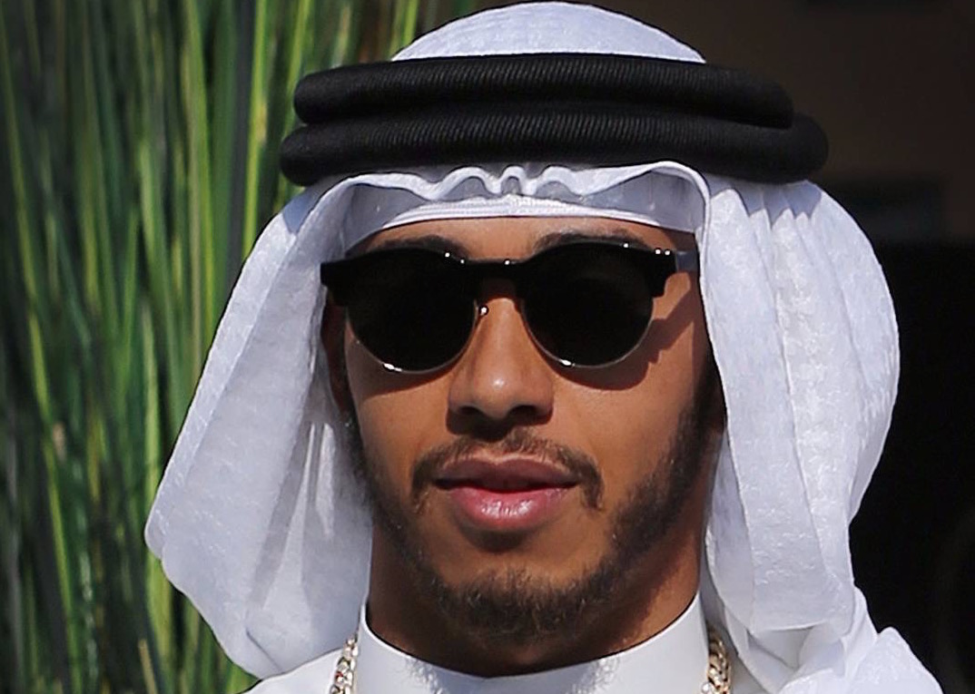 Racing ace Lewis Hamilton arrives at the Bahrain Grand Prix in a Thawb, the traditional Arabic dress of men (source: zetbradaily.blogspot.com)