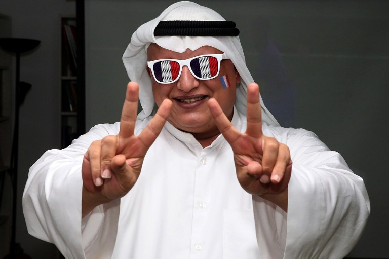 A French football team supporter flashes the sign for victory as he watches the UEFA Euro 2016 final football match between France and Portugal, hosted in Paris, at the French Institue in Kuwait City on July 10, 2016. YASSER AL-ZAYYAT / AFP