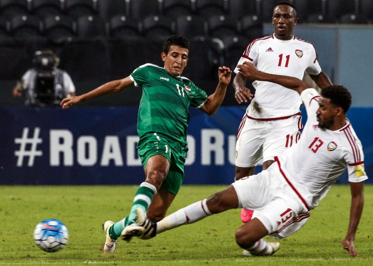 Iraq's Amjed Attwan (L) is tackled by UAE's Khamis Esmaeel during the 2018 World Cup qualifying football match between Iraq and the United Arab Emirates at Sheikh Mohammed Bin Zayed stadium in Abu Dhabi on November 15, 2016. Karim Sahib / AFP