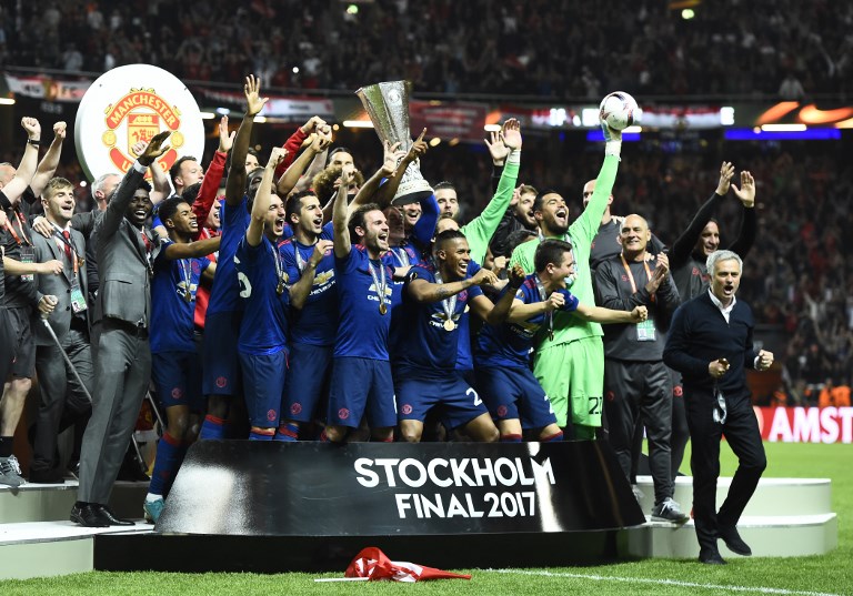 Manchester United's players celebrate with the trophy after winning the UEFA Europa League final football match Ajax Amsterdam v Manchester United on May 24, 2017 at the Friends Arena in Solna outside Stockholm.