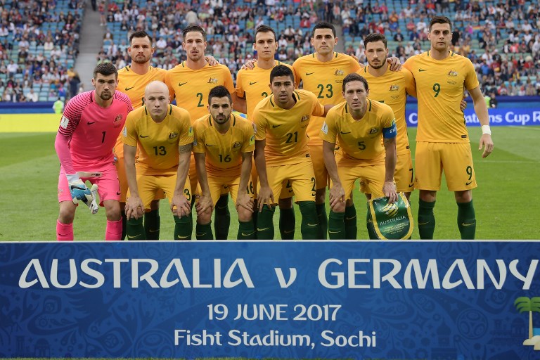 Australia's football team players (back L-R) Bailey Wright, Milos Degenek, Trent Sainsbury, Tommy Rogic, Mathew Leckie, Tomi Juric, (front L-R) Mathew Ryan, Aaron Mooy, Aziz Behich, Massimo Luongo, Mark Milligan during their 2017 Confederations Cup group B match against Germany at the Fisht Stadium in Sochi on June 19, 2017. FRANCK FIFE / AFP