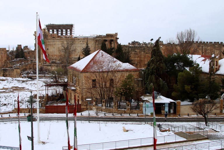 Partial view of the snow-clad Roman ruins in the city of Baalbeck in Lebanon's Bekaa valley. STRINGER / AFP