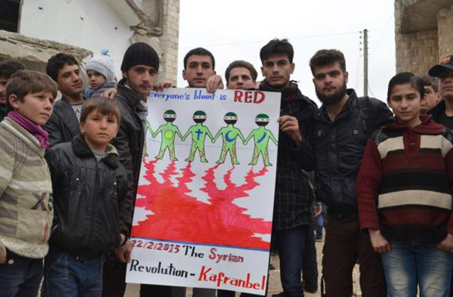 While Syrian opposition fighters are accused of stirring sectarianism, these Syrians have been busy trying to prove that not everyone feels the same. As the sign says, Christian or Muslim blood is still blood.