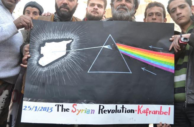 Nothing says ‘revolution’ like a Pink Floyd cover poster and a multi-colored, multi-faceted message from the heart of Syria said it all. A rainbow prism beaming light on the troubled country came from abroad, not inside, the nation.
