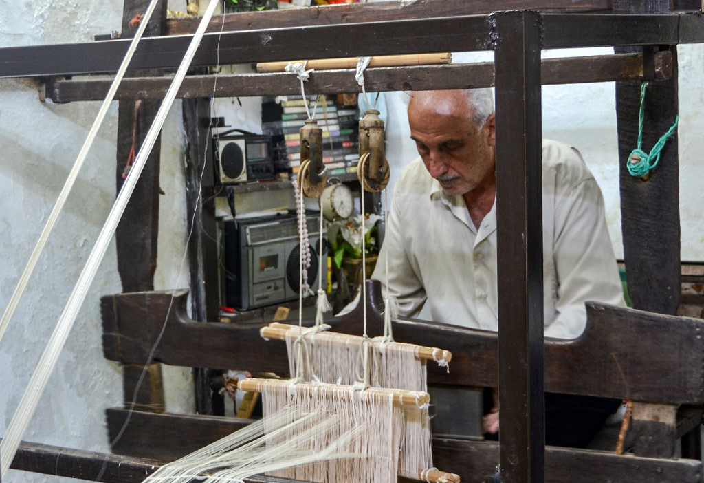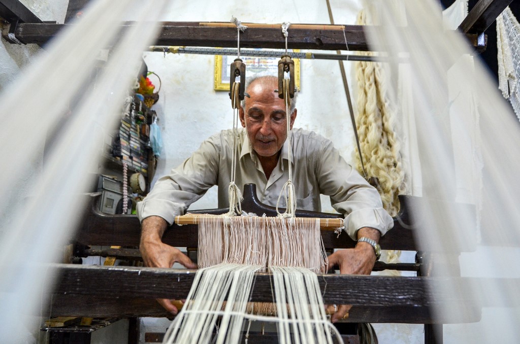 Muhammad Saud, a 65-year-old Syrian silk farmer, handweaves silk threads on a loom at his home workshop in the village of Deir Mama, in west-central Syria on June 22, 2020. MAHER AL MOUNES / AFP