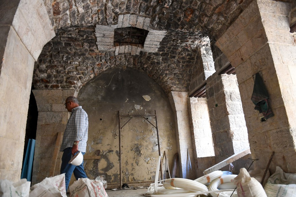 Syrian workers take part in the reconstruction of Martini restaurant and hotel in the Jdaideh neighbourhood in Aleppo's Old City on October 17, 2020. AFP