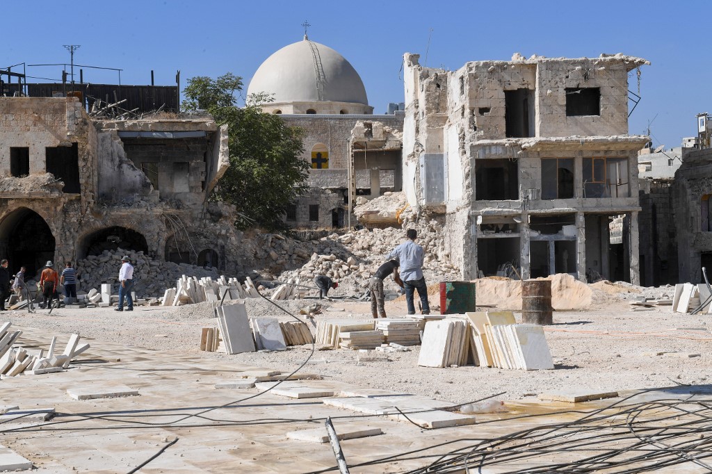 Syrian workers take part in the reconstruction of the Hatab Square in the Jdaideh neighbourhood in Aleppo's Old City on October 17, 2020. AFP