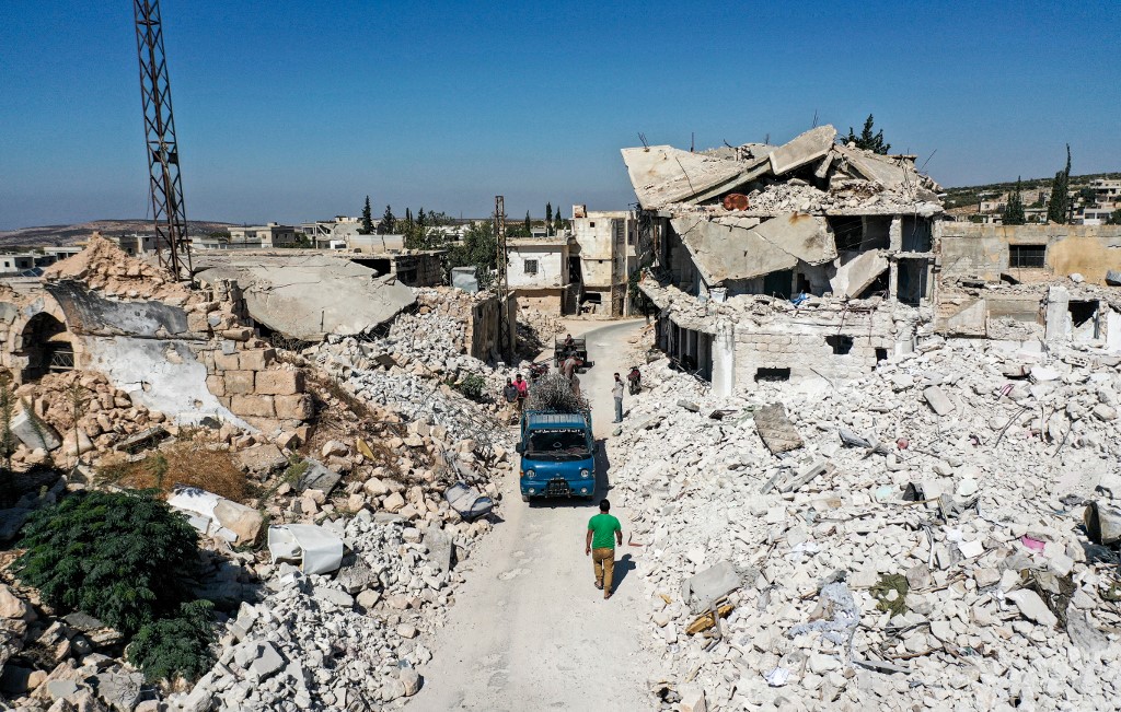 People collect scrap steel rods from the rubble and destruction in the aftermath of aerial bombardment in the town of Ihsim in Syria's rebel-held northwestern Idlib province, on October 18, 2020. Omar HAJ KADOUR / AFP