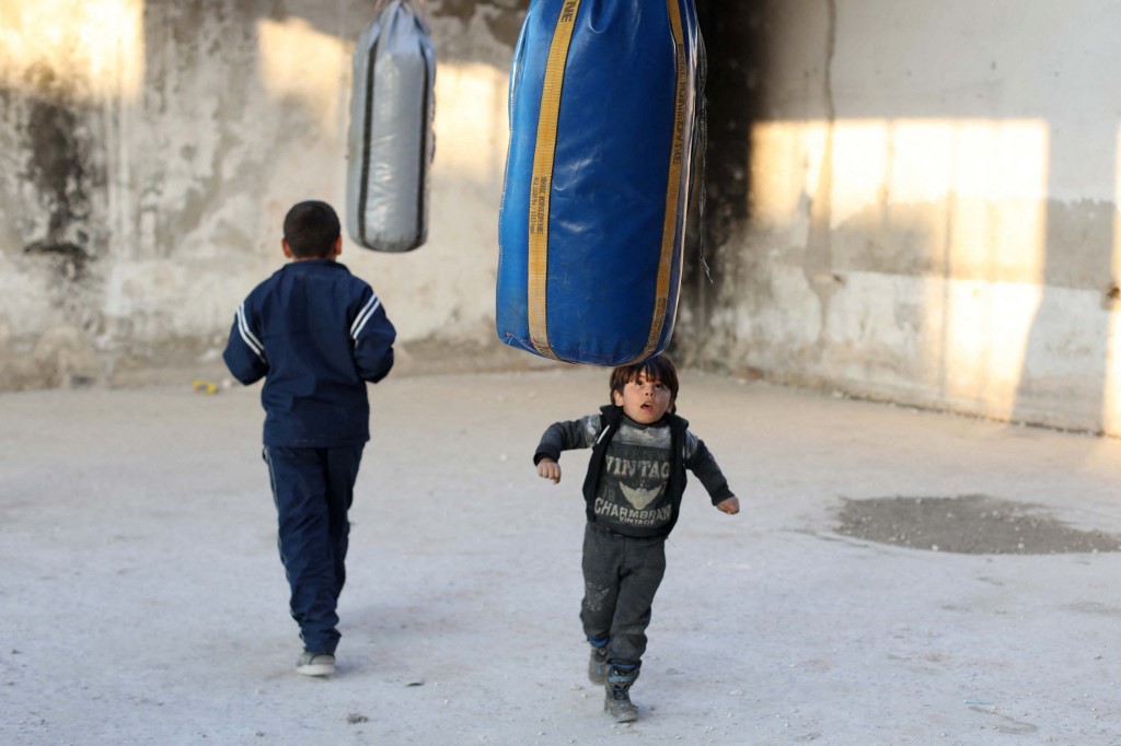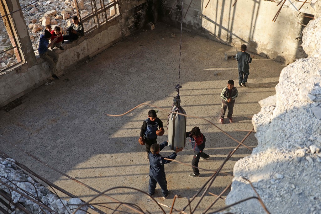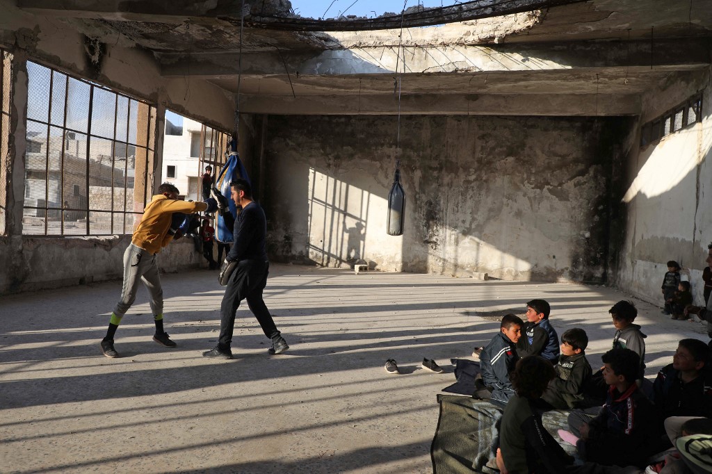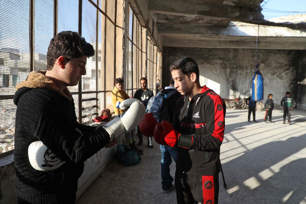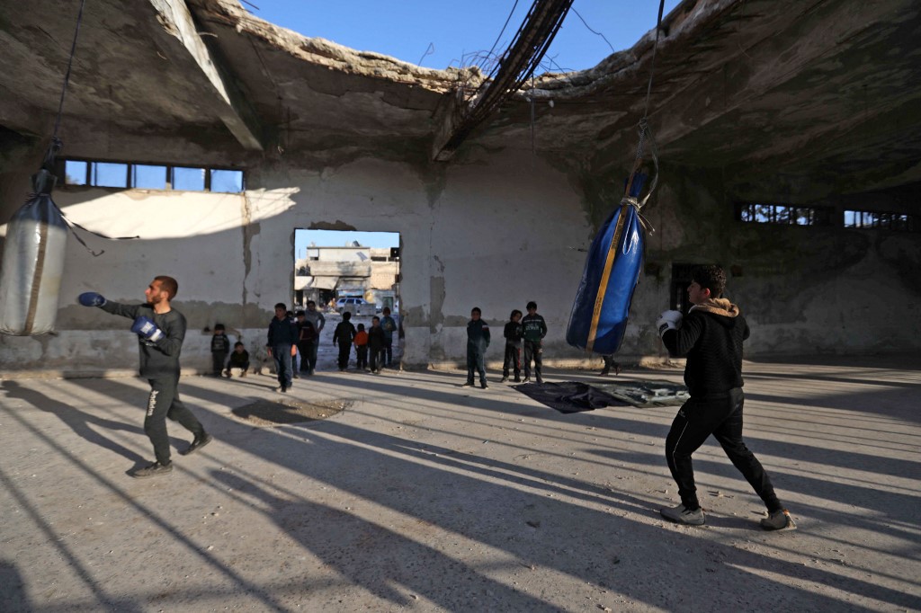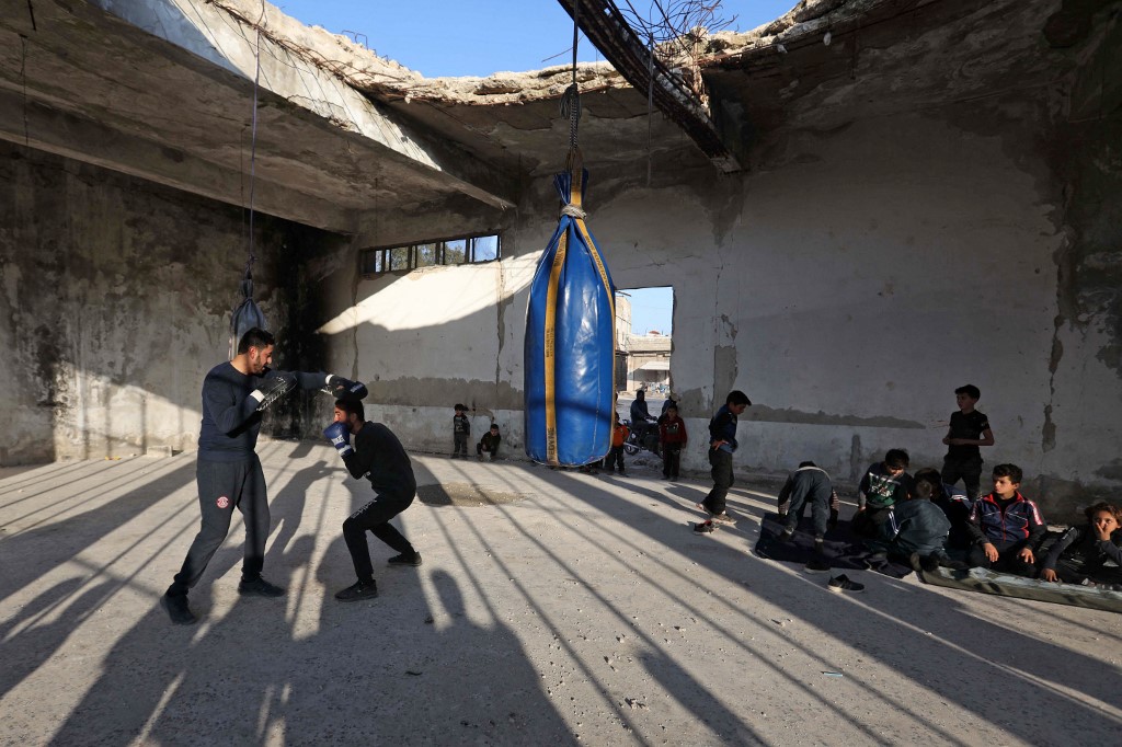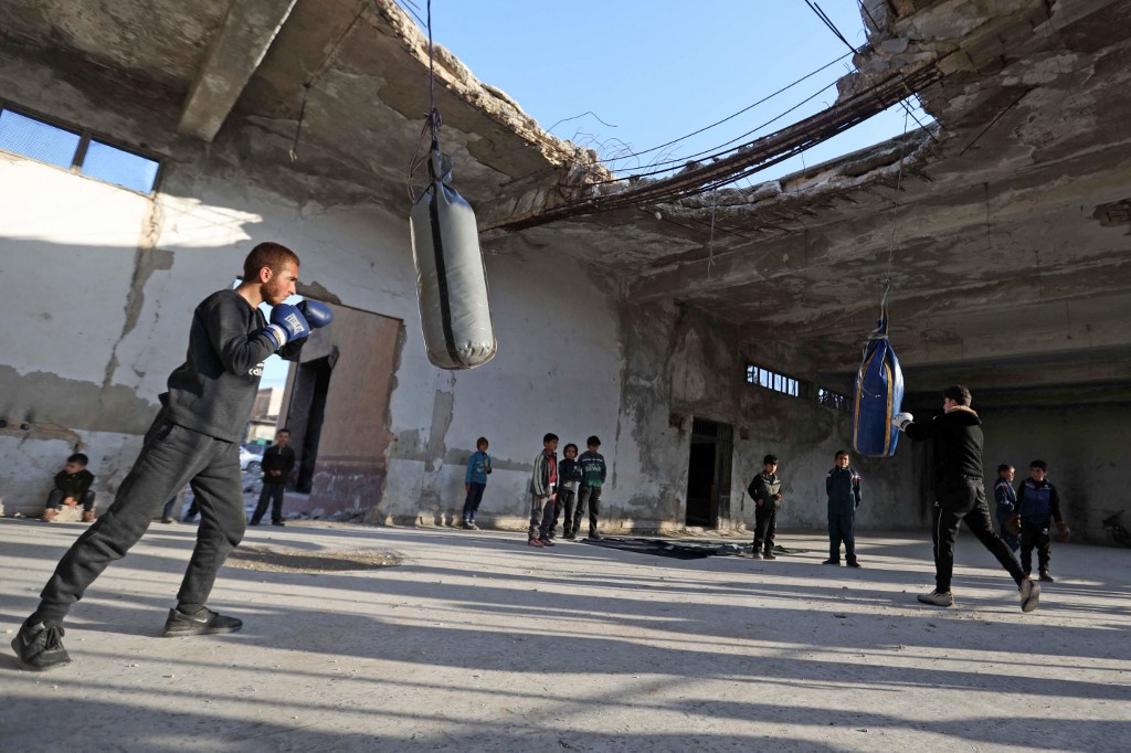 Syrians are trying to move on with their lives after civil war and economic crisis, youths have started to practice a boxing workout on the hands of local boxer Ahmad Dwara inside a damaged building in Atarib town, western Aleppo countryside.