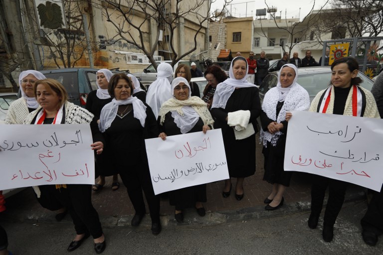 Residents of the Golan Heights raise Syrian and banners during a protest against the backing of Israel's capture of the Golan Heights by the US president, in the village of Majdal Shams in the Israeli-annexed territory on March 23, 2019. Jalaa MAREY / AFP