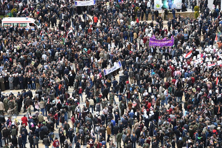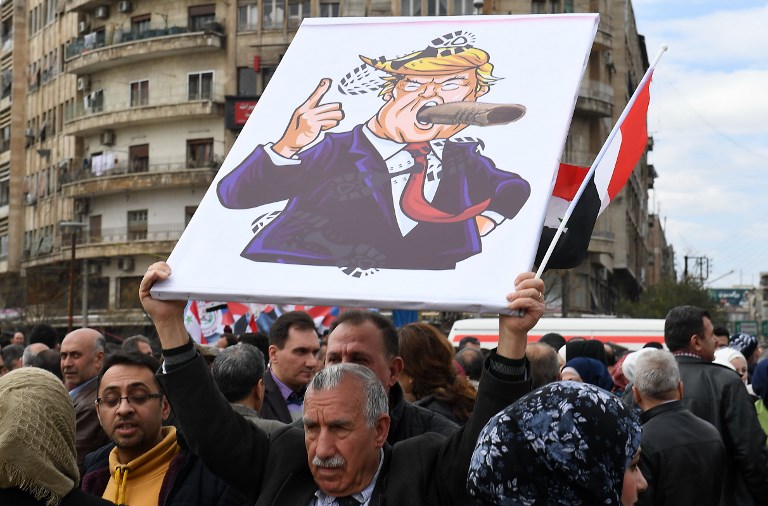 Syrians protest in the northern city of Aleppo against the US decision to recognise Israel's sovereignty over the Golan Heights on March 26, 2019. GEORGE OURFALIAN / AFP