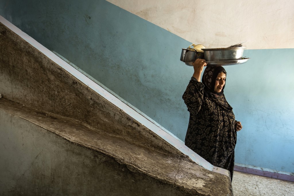 A woman walks down a stairwell while carrying pots on her head at a school building where Syrians -- displaced from the area of Ras al-Ain by the Turkish offensive on the northeast -- are staying in the city of Hasakah, on June 30, 2020. Delil SOULEIMAN / AFP