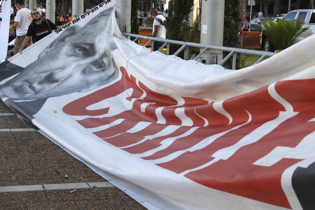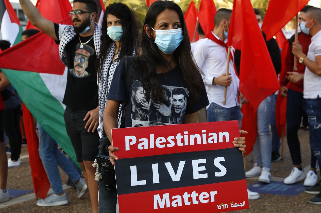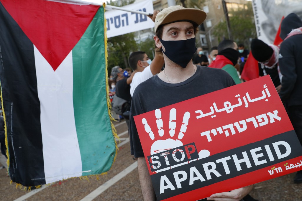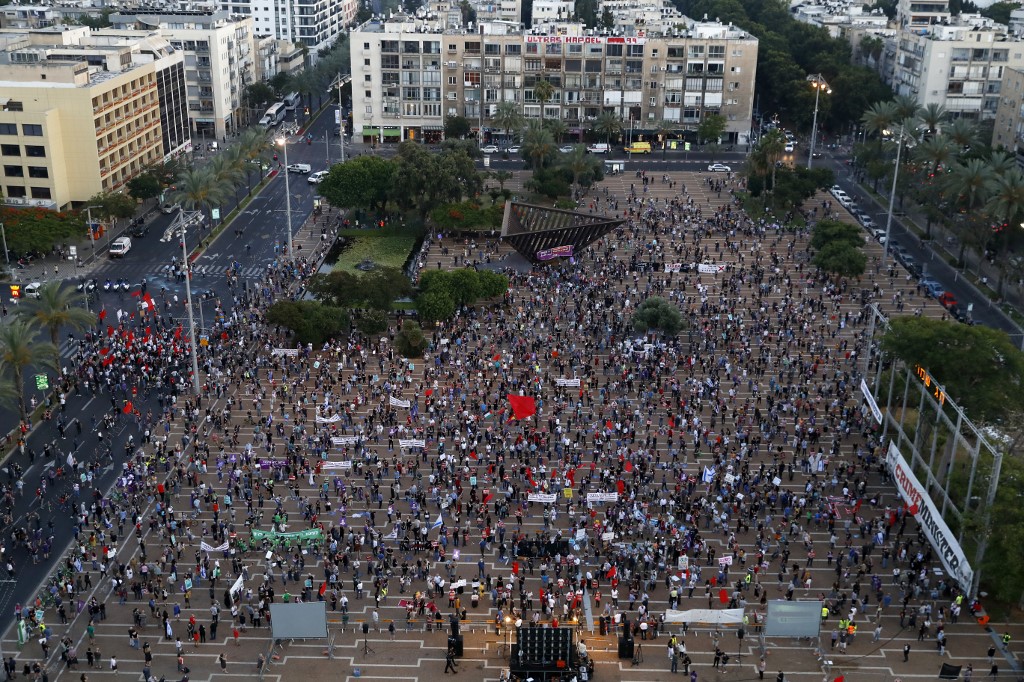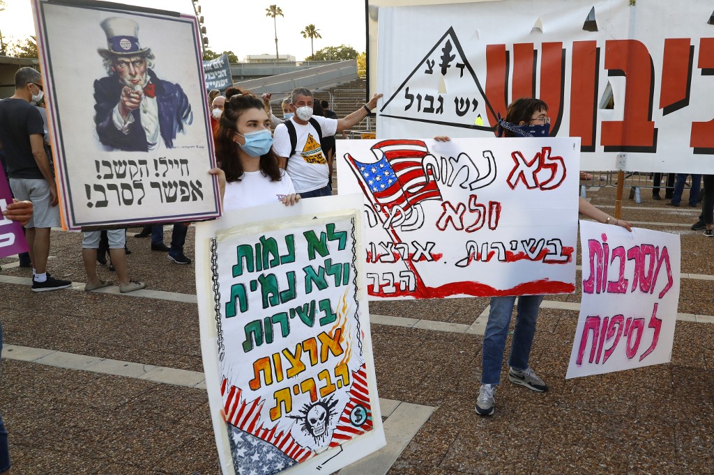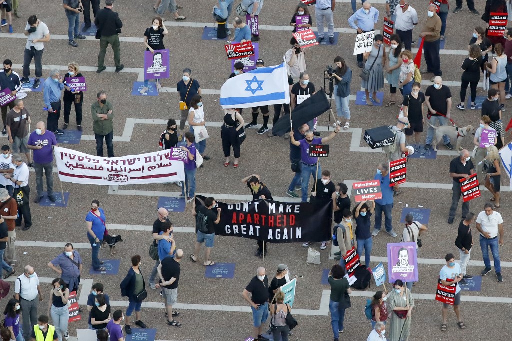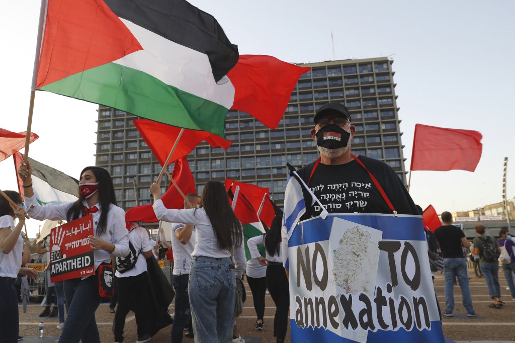 Demonstrators waved Israeli and Palestinians flags and held placards against the occupation of the West Bank and the possible annexation of parts of it, in a rally organised by leftwing NGOs and political parties.
