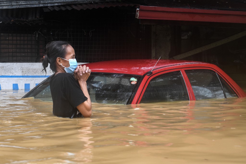 A resident makes her way through a flooded street to shelter after Typhoon Vamco hit, in Marikina City, suburban Manila on November 12, 2020. Ted ALJIBE / AFP