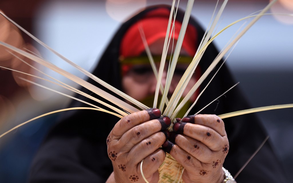 An Emirati woman knits together straw leaves in a display of traditional crafts on the first day of the Abu Dhabi International Hunting and Equestrian exhibition (ADIHEX) in the UAE capital on August 31, 2019. KARIM SAHIB / AF