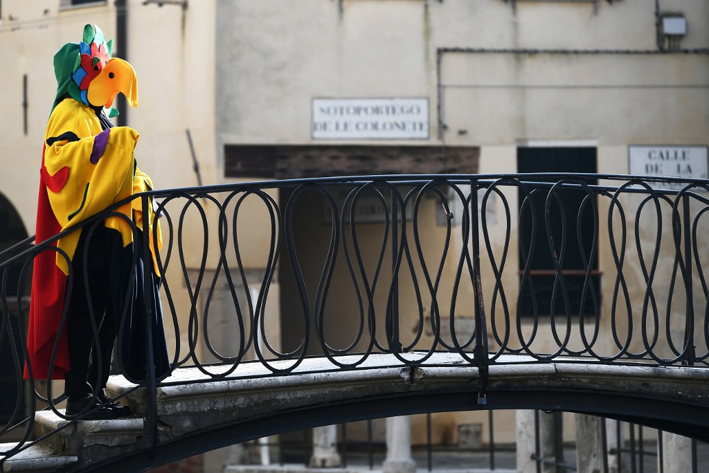 Masked reveller poses in Riva degli Schiavoni during the opening of the Venice Carnival on February 09, 2020. The carnival in Venice takes place until February 25, 2020. Vincenzo PINTO / AFP