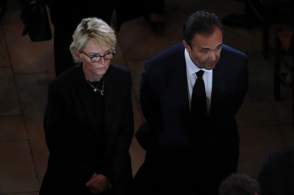 Claude Chirac, daughter of late French president Jacques Chirac, and her husband Frederic Salat-Baroux leave Saint Sulpice church in the Paris following her father's final service on September 30, 2019. Francois Mori / POOL / AFP