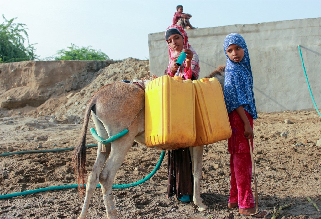 Yemeni girls fill jerrycans carried by donkeys with water from a cistern at a make-shift camp for the internally displaced, in the northern Hajjah province, on June 7, 2020, amid a severe shortage of water. ESSA AHMED / AFP