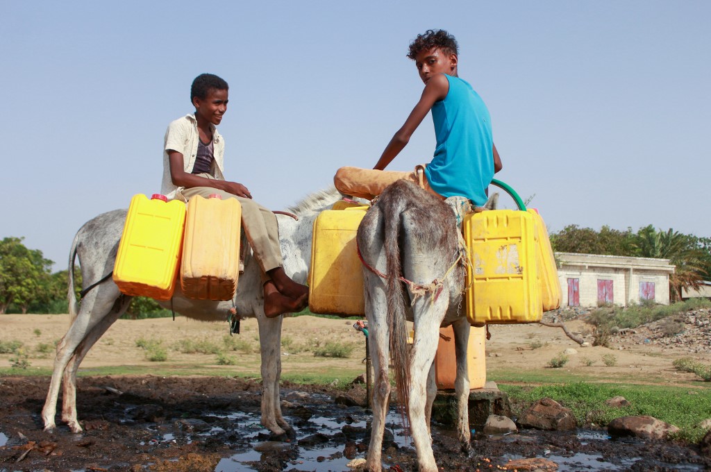 Yemeni youths, some riding donkeys, wait to fill their jerrycans with water from a cistern at a make-shift camp for the internally displaced, in the northern Hajjah province, on June 7, 2020, amid a severe shortage of water. ESSA AHMED / AFP