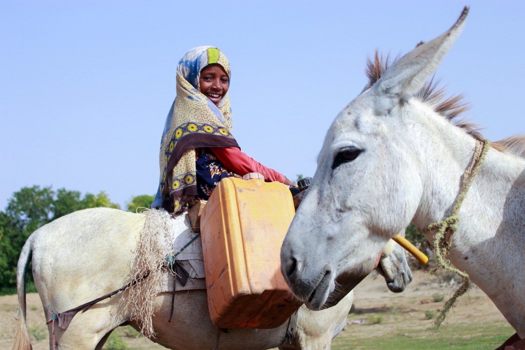 A Yemeni girl riding a donkey waits to fill jerrycans with water from a cistern at a make-shift camp for the internally displaced, in the northern Hajjah province, on June 7, 2020, amid a severe shortage of water. ESSA AHMED / AFP