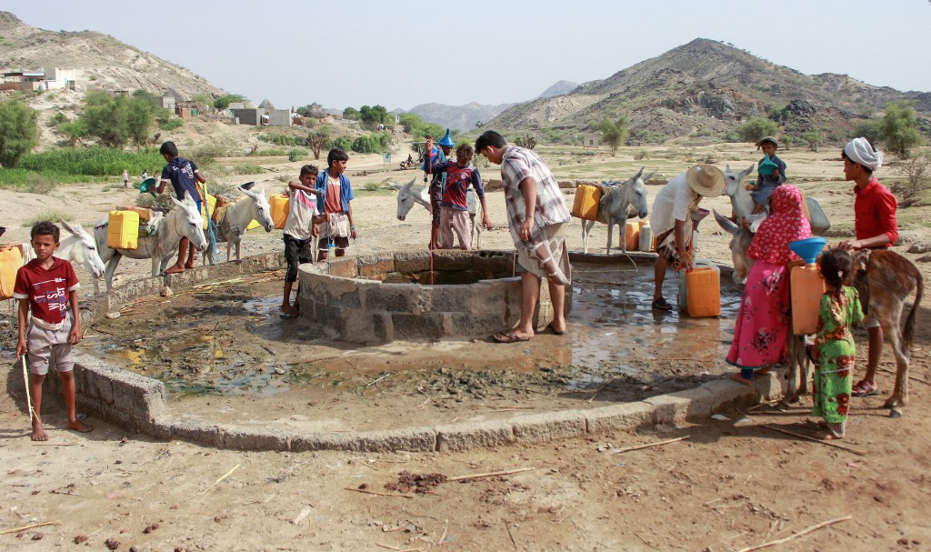 Yemenis fill their jerrycans carried by donkeys, with water from a cistern at a make-shift camp for the internally displaced, in the northern Hajjah province, on June 7, 2020, amid a severe shortage of water. ESSA AHMED / AFP