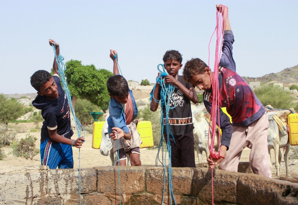 Yemeni youths fill jerrycans carried by donkeys with water from a cistern at a make-shift camp for the internally displaced, in the northern Hajjah province, on June 7, 2020, amid a severe shortage of water. ESSA AHMED / AFP