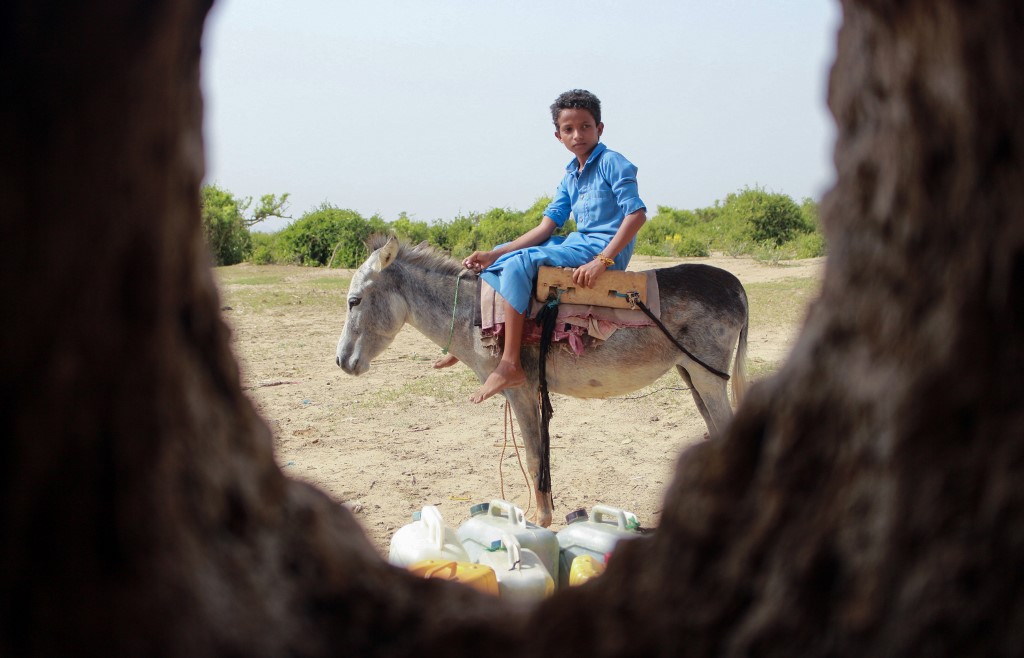 A Yemeni youth riding a donkey waits to fill jerrycans with water from a cistern at a make-shift camp for the internally displaced, in the northern Hajjah province, on June 7, 2020, amid a severe shortage of water. ESSA AHMED / AFP