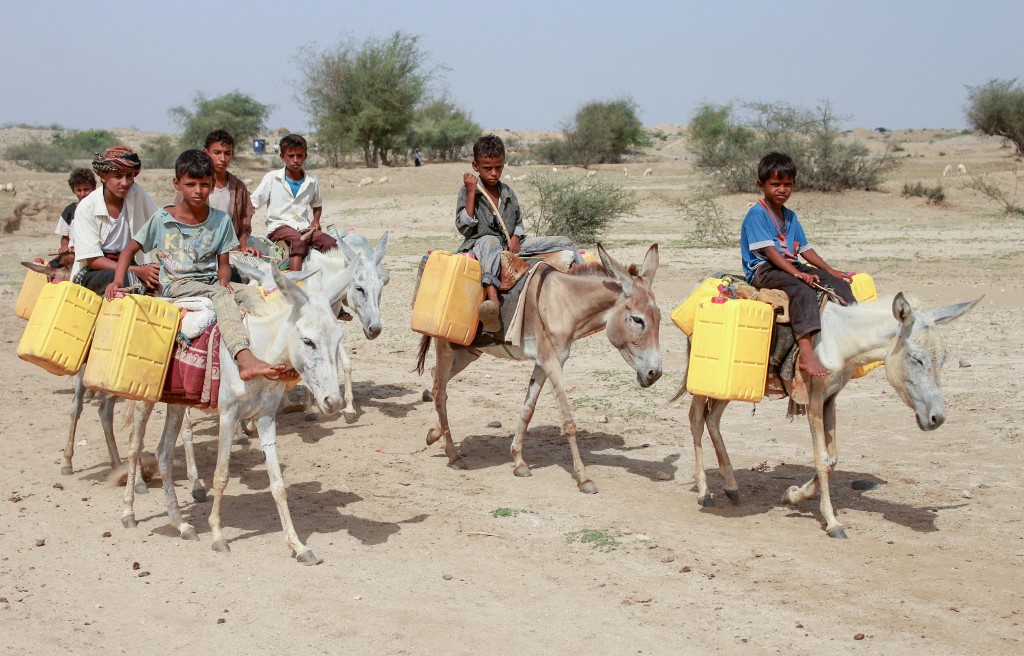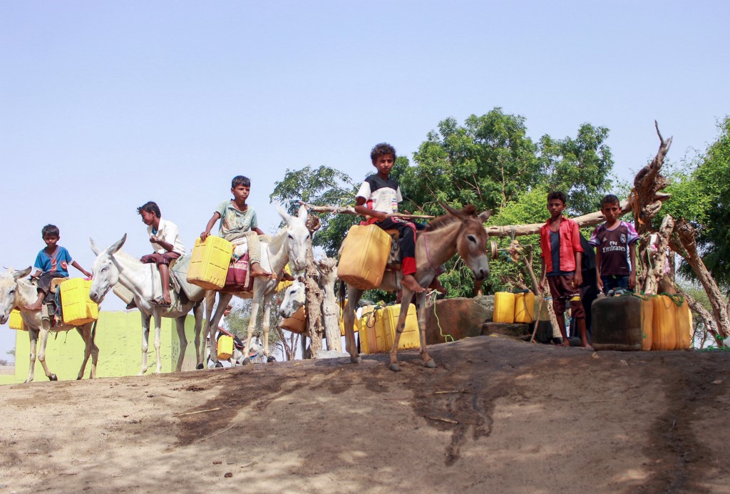Yemeni children riding donkeys arrive to fill their jerrycans with water from a cistern at a make-shift camp for the internally displaced, in the northern Hajjah province, on June 7, 2020, amid a severe shortage of water. ESSA AHMED / AFP