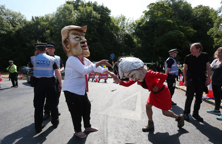 Protesters wearing masks depicting US President Donald Trump (L) and Britain's Prime Minister Theresa May (R) join other protesters against the UK visit of US President Donald Trump demonstrate outside Chequers, the prime minister's country residence, where Trump and May are holding a meeting. (Isabel INFANTES / AFP)