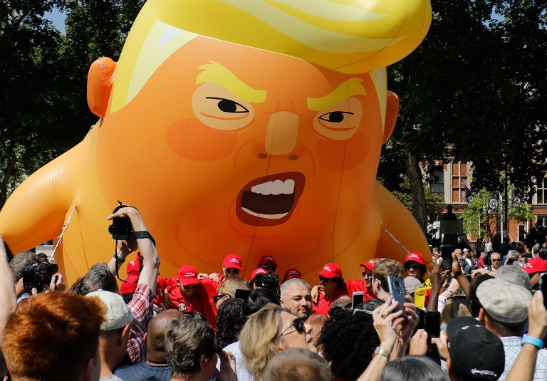 Activists inflate a giant balloon depicting US President Donald Trump as an orange baby during a demonstration against Trump's visit to the UK in Parliament Square in London on July 13, 2018. (Tolga AKMEN / AFP)