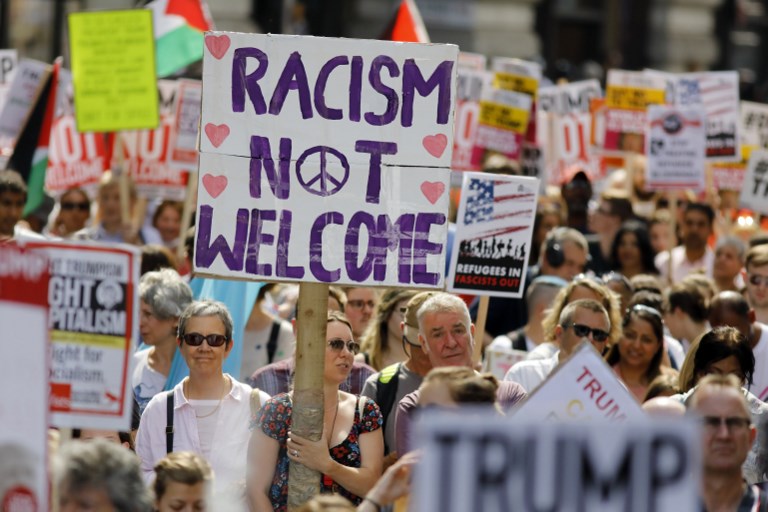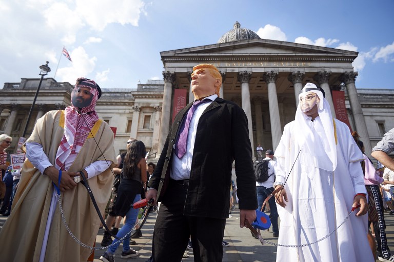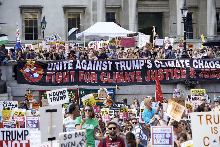 Protesters against the UK visit of US President Donald Trump gather in Trafalgar Square after taking part in a march in London on July 13, 2018.(Niklas HALLEN / AFP)