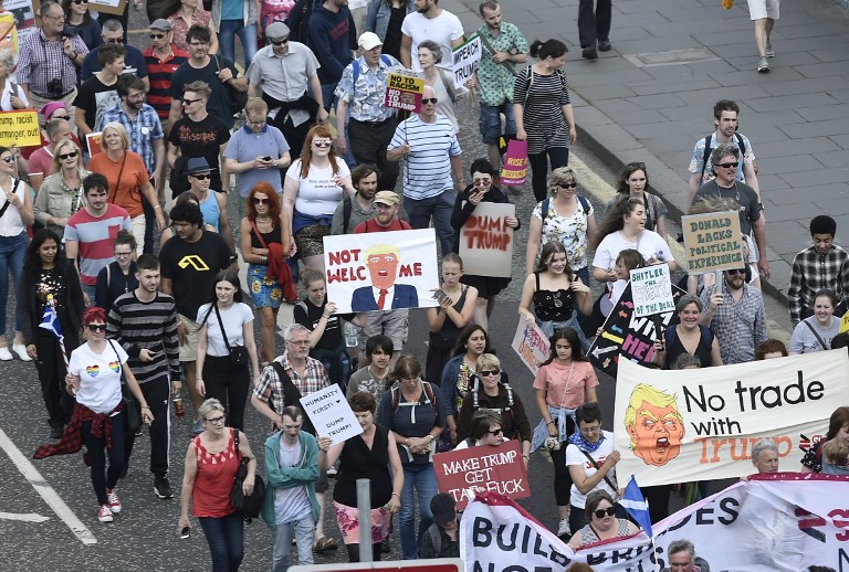 Protestors carry placards as they take part in the Scotland United Against Trump demonstration through the streets of Edinburgh, Scotland on July 14, 2018, on the third day of US President Donald Trump's four-day UK visit. (NEIL HANNA / AFP)