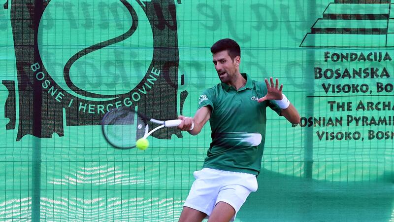 Serbian tennis player Novak Djokovic returns the ball during an exhibition match, organised to mark the opening of a tennis court at the "Archaeological park of the Bosnian pyramid" near Visoko, north of Sarajevo, on July 13, 2022. (Photo by ELVIS BARUKCIC / AFP)
