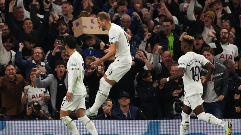 Tottenham Hotspur's English striker Harry Kane (C) celebrates with teammates after scoring a penatly kick and his team second goal during the UEFA Champions League Group D football match between Tottenham Hotspur and Eintracht Frankfurt at the Tottenham Hotspur Stadium, in London, on October 12, 2022. (Photo by Adrian DENNIS / AFP)