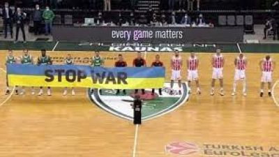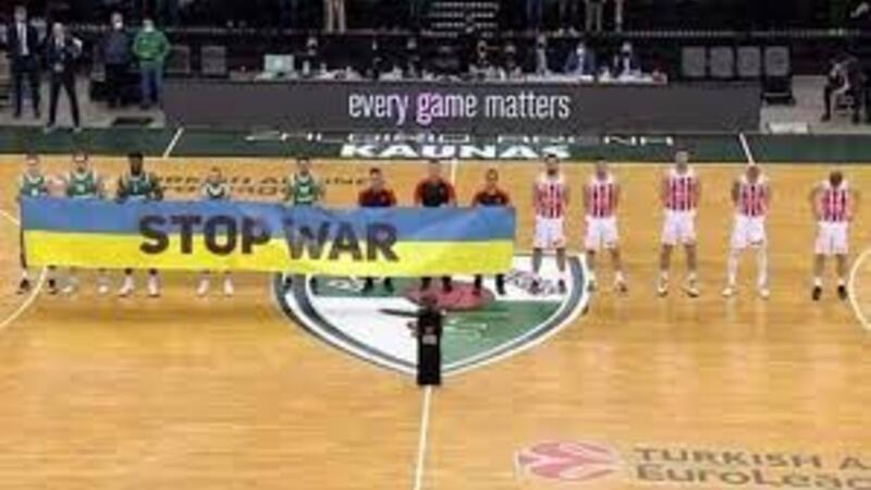 Before Sunday's game against Zalgiris Kaunas, players for the home team and the three referees displayed a banner in the blue and yellow colors of Ukraine that read: "Stop War".