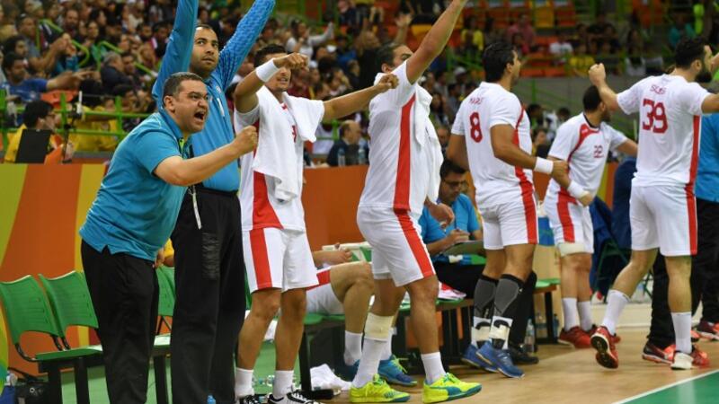 Tunisia celebrates scoring during the men's preliminaries Group A handball match Tunisia vs Qatar for the Rio 2016 Olympics Games at the Future Arena in Rio on August 11, 2016.
