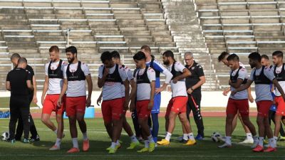 Tunisian players attend a training session on June 8, 2020 at the Elmanzeh stadium in Tunis, following 3 months of inactivity because of the Covid-19 pandemic crisis.